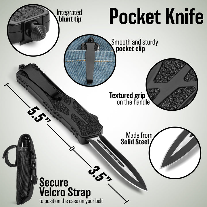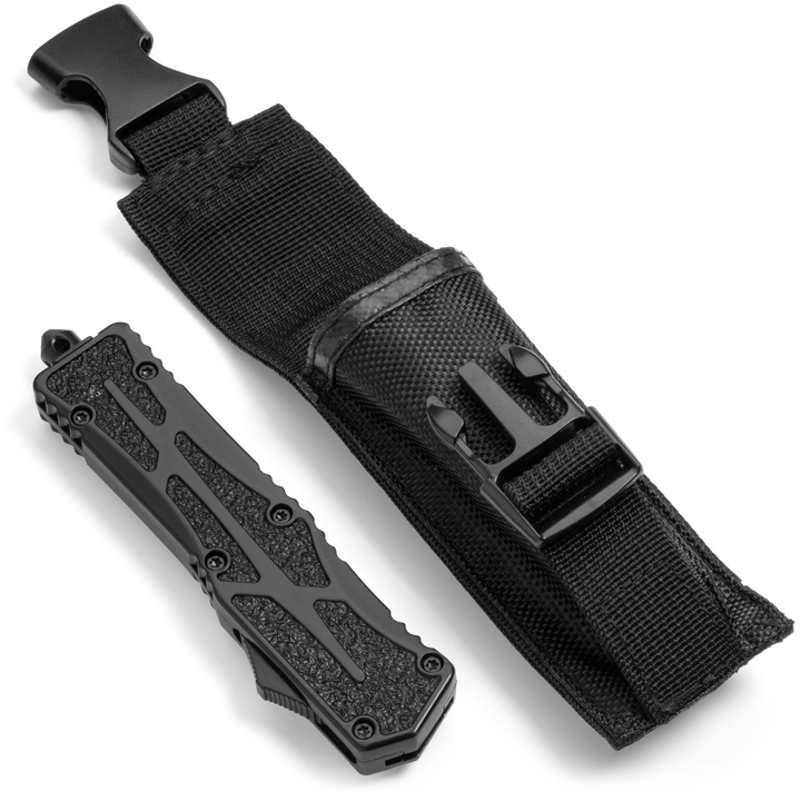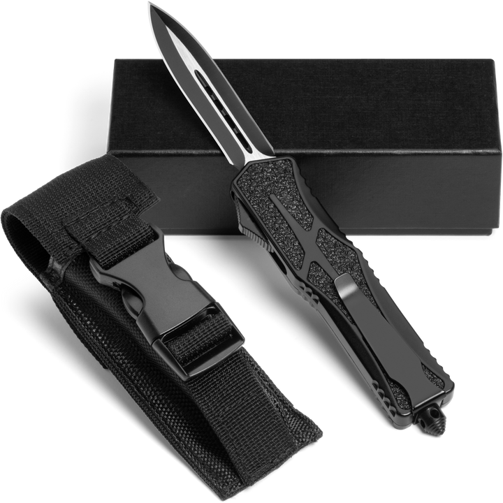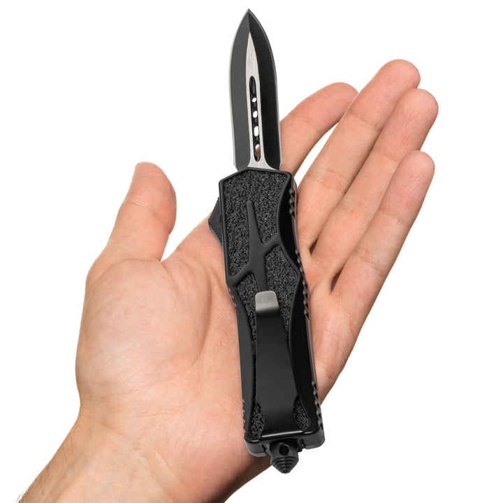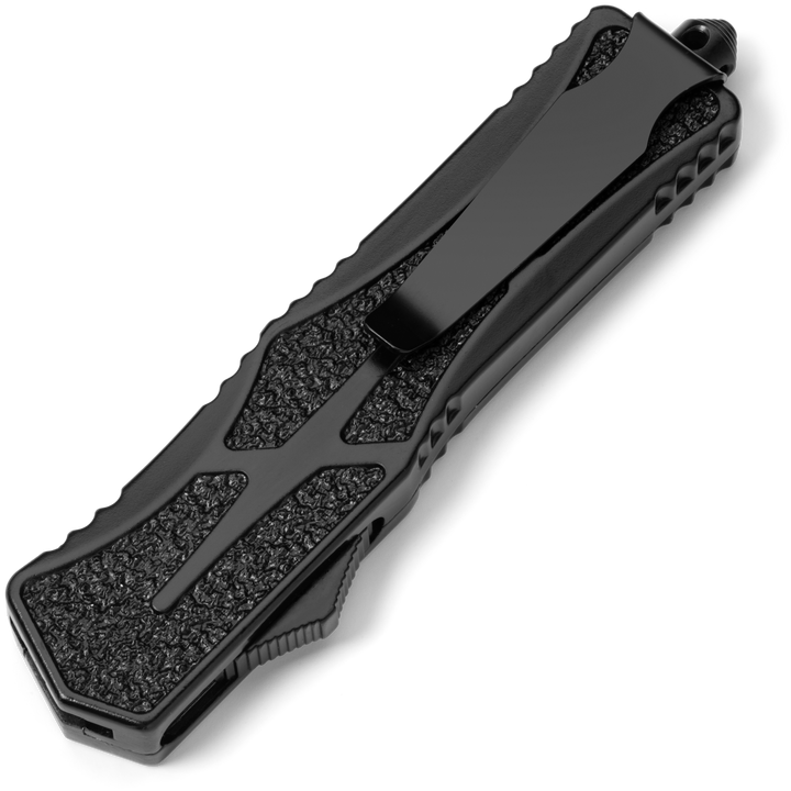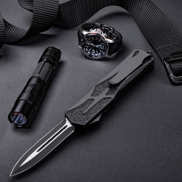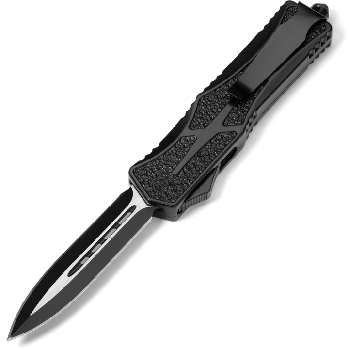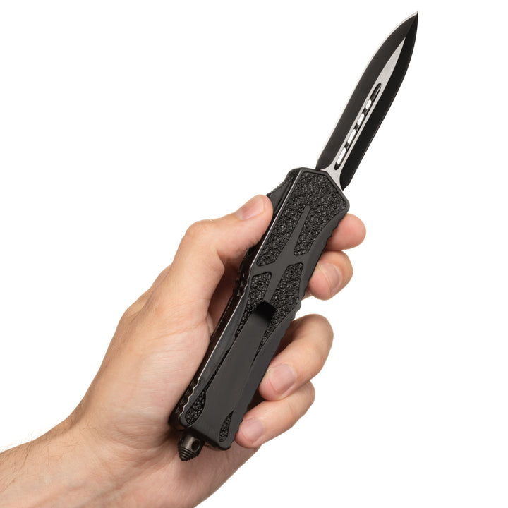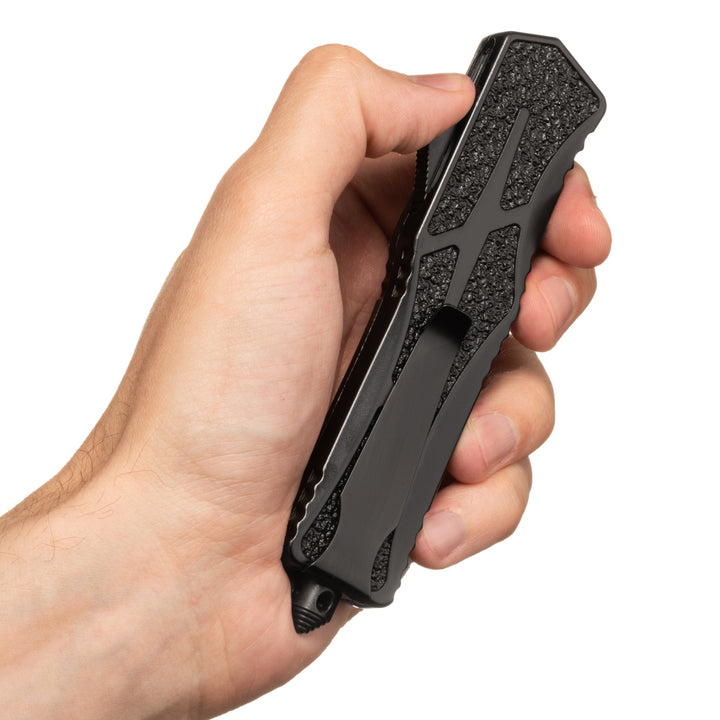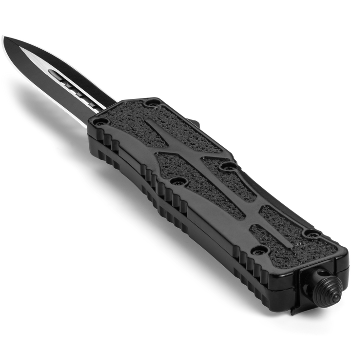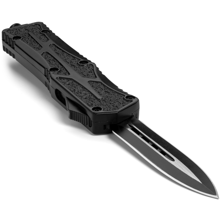 Phantom - OTF Knife - Black / Textured A full size, non slip OTF for the everyday warrior! This OTF Knife was designed with extra secure handling featuring a textured handle to ensure a firm grip. The crisp action is lightening fast and the double sided steel blade cuts with ease.