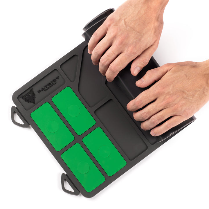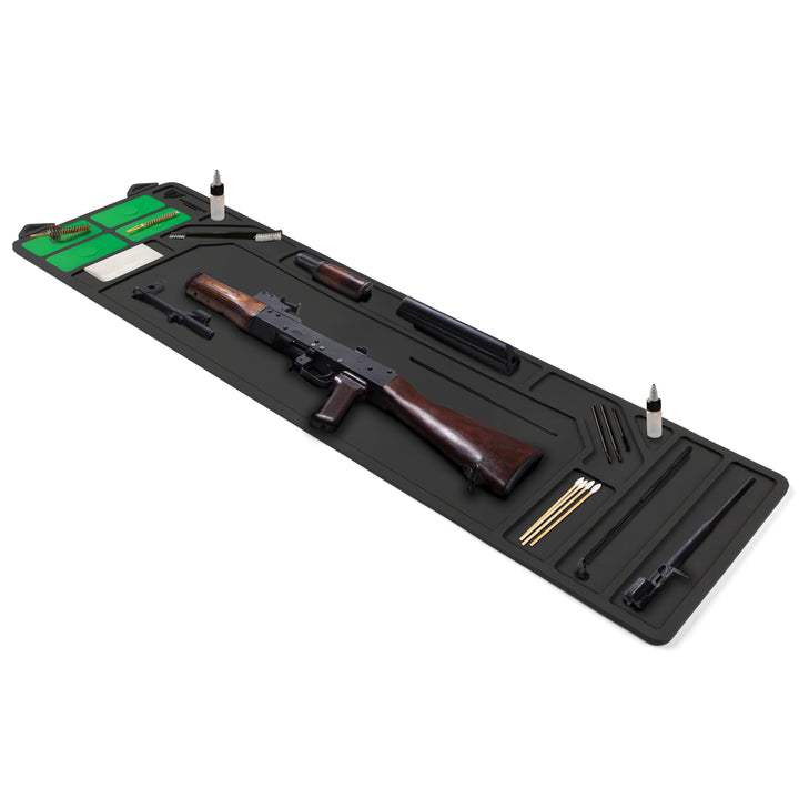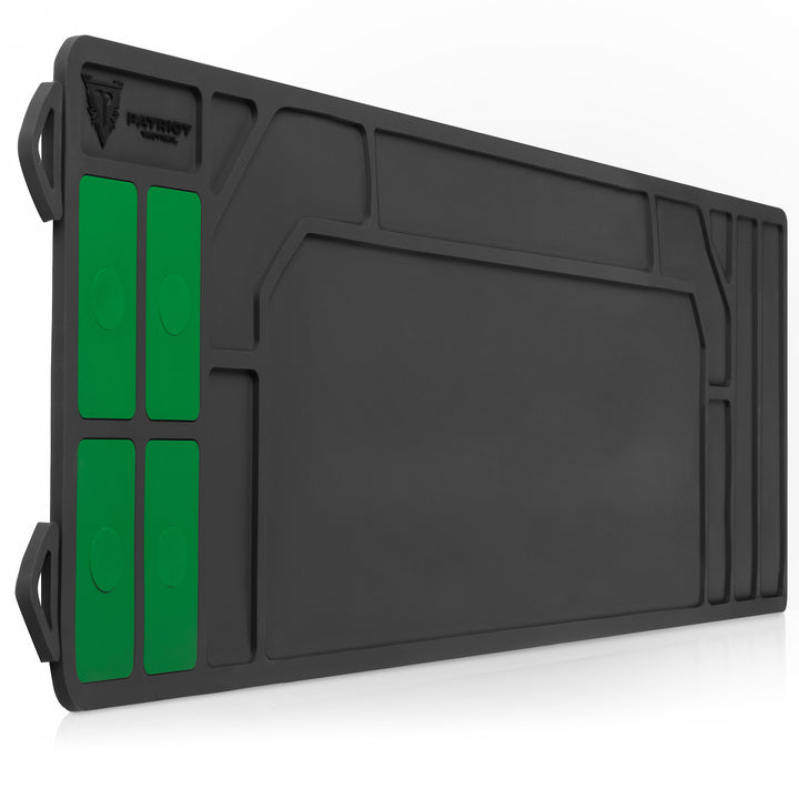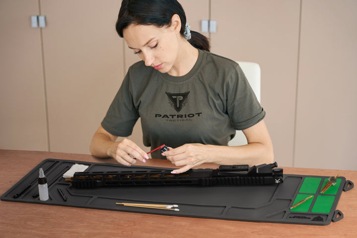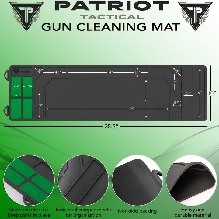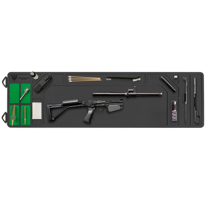 Cleaning Mat - Rifle The Patriot Tactical Rifle length Cleaning Mat keeps your parts tidy and your workspace clean. With magnetized parts holders and waterproof construction, you are guaranteed to never try and work on your gear sitting on an old towel again!